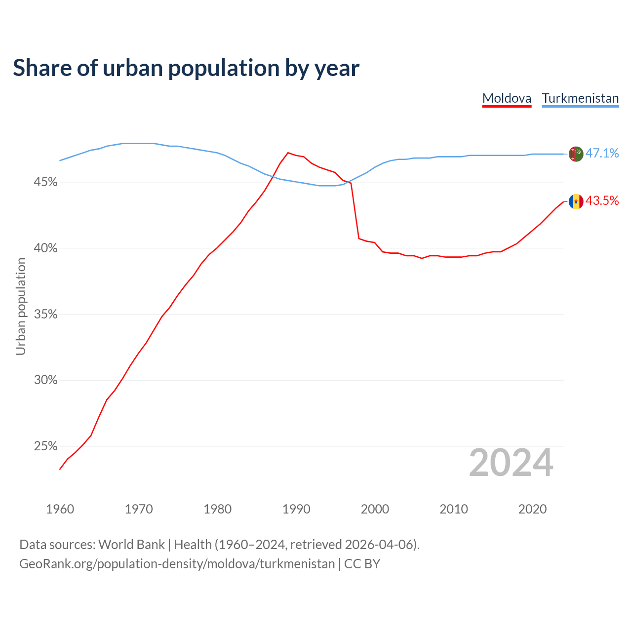 From 2004 to 2024, the share of urban population changed from 39.4% to 43.5% in Moldova and from 46.7% to 47.1% in Turkmenistan.