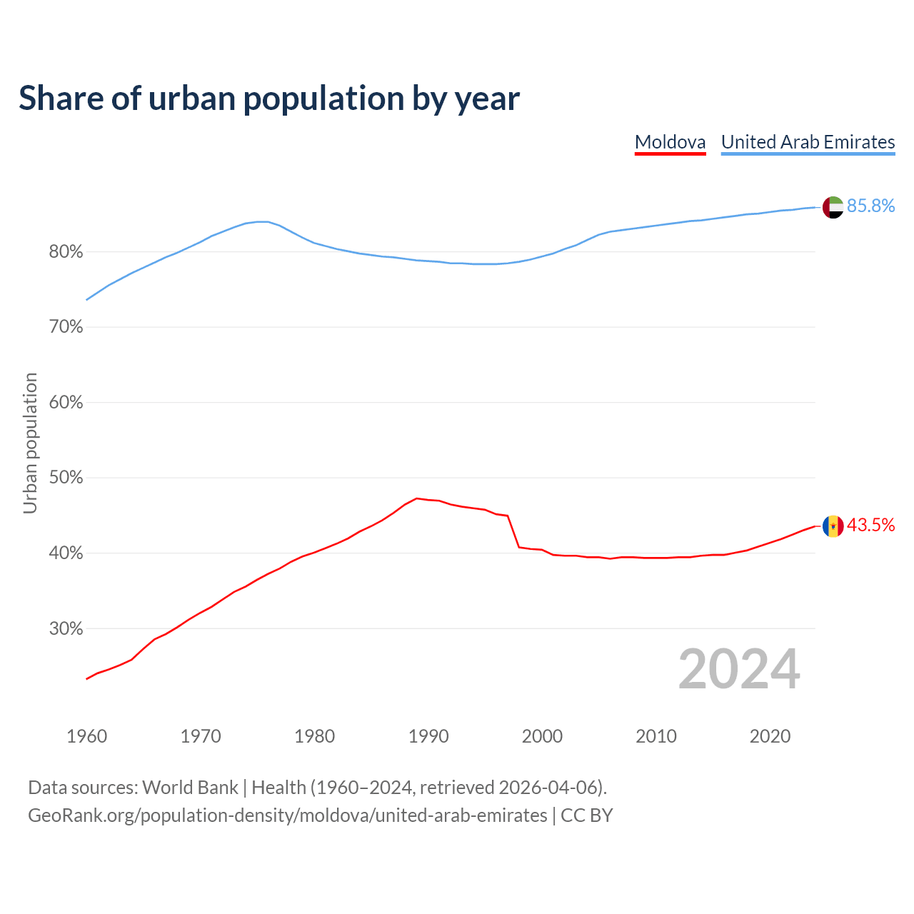 From 2004 to 2024, the share of urban population changed from 39.4% to 43.5% in Moldova and from 81.5% to 85.8% in the United Arab Emirates.