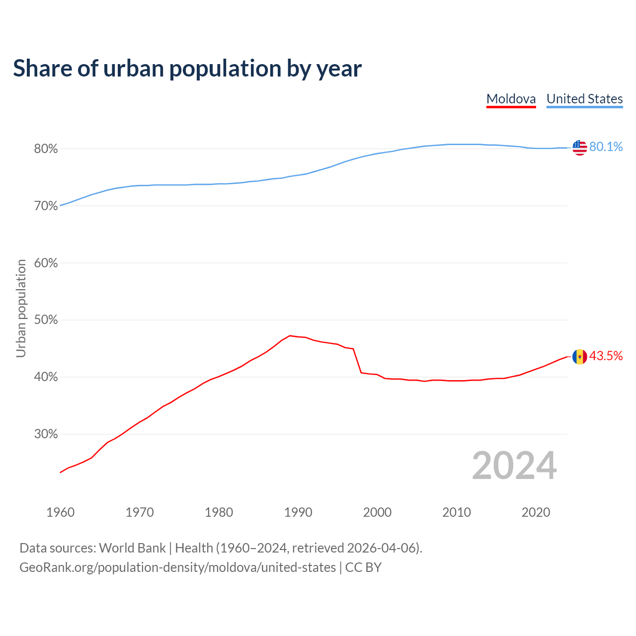 From 2004 to 2024, the share of urban population changed from 39.4% to 43.5% in Moldova and from 80% to 80.1% in the United States.