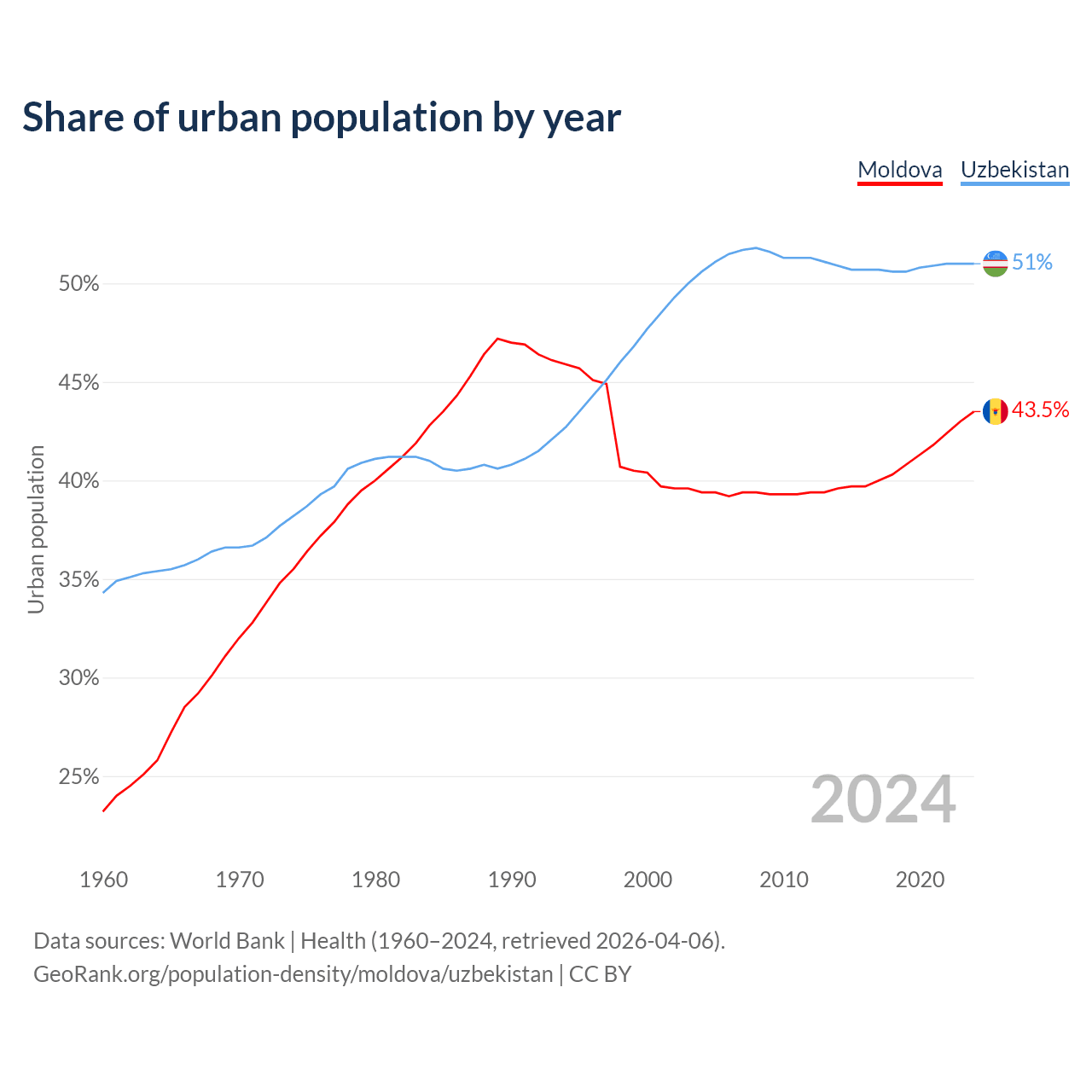 From 2004 to 2024, the share of urban population changed from 39.4% to 43.5% in Moldova and from 50.6% to 51% in Uzbekistan.