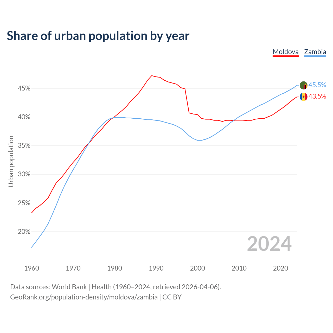 From 2004 to 2024, the share of urban population changed from 39.4% to 43.5% in Moldova and from 36.8% to 45.5% in Zambia.