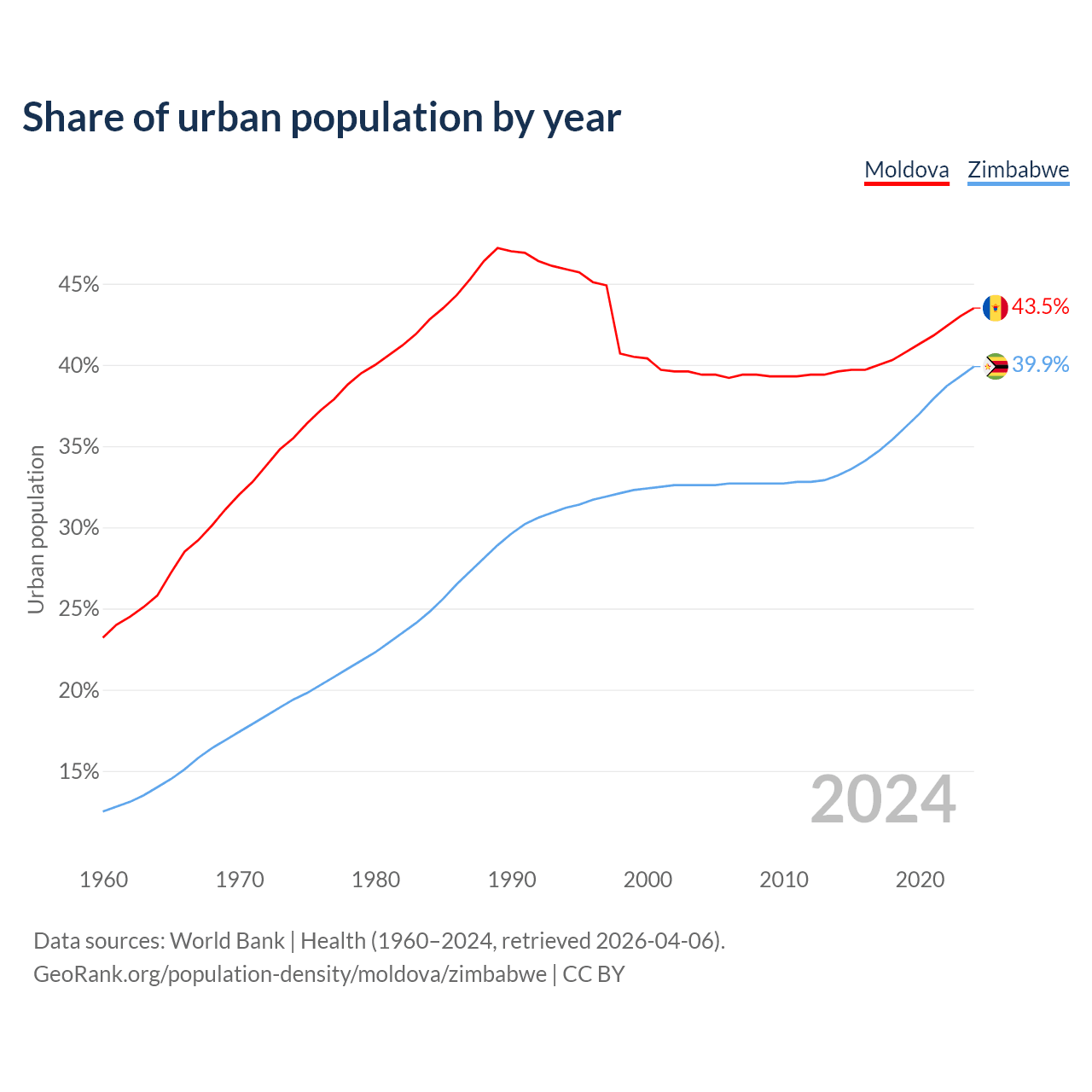 From 2004 to 2024, the share of urban population changed from 39.4% to 43.5% in Moldova and from 32.6% to 39.9% in Zimbabwe.