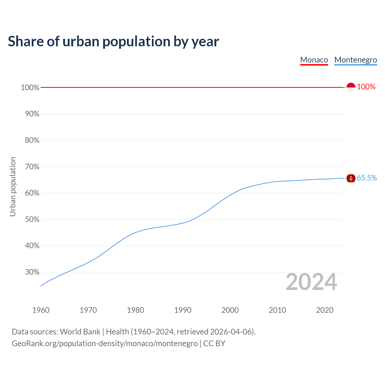 From 2004 to 2024, the share of urban population changed from 100% to 100% in Monaco and from 62.2% to 65.5% in Montenegro.