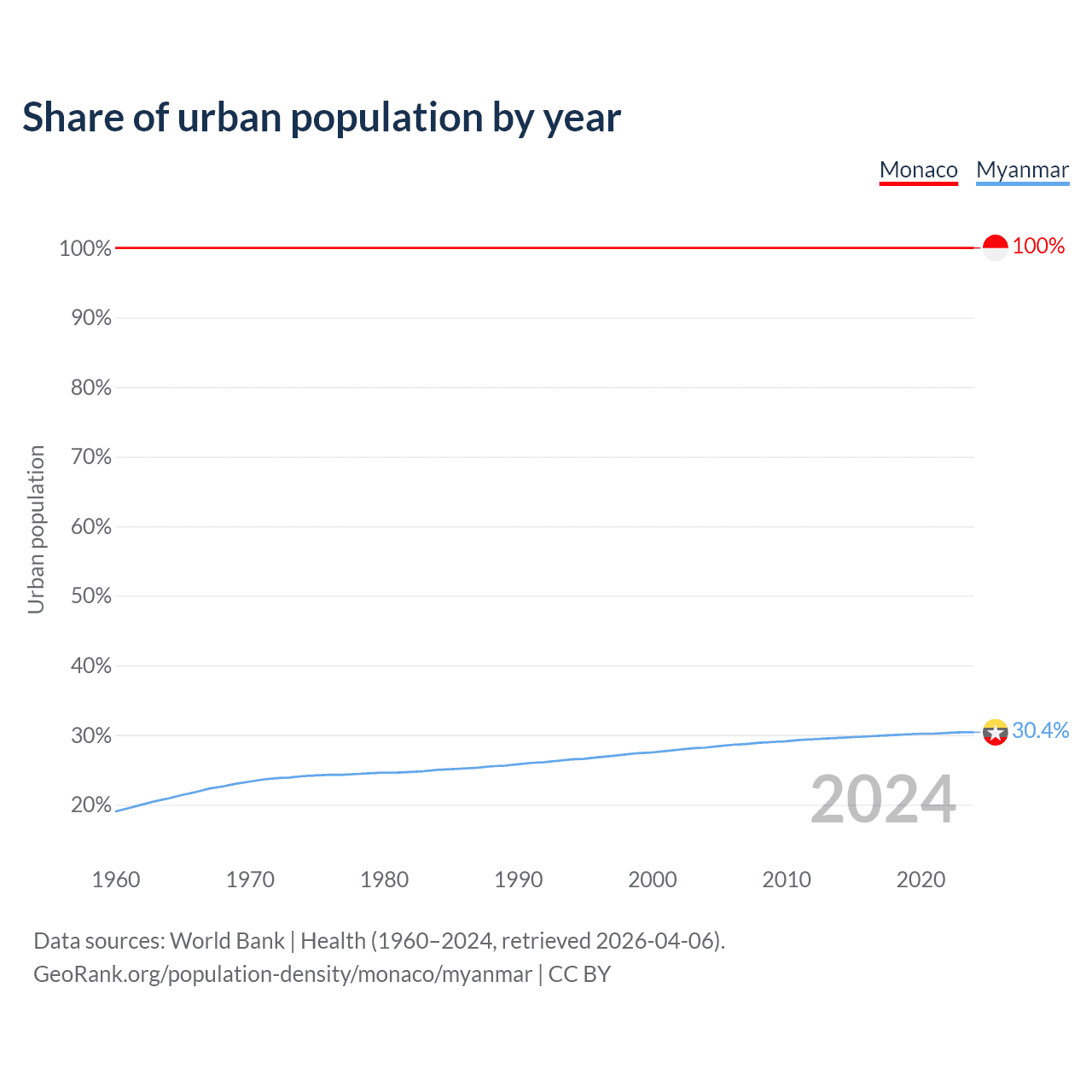 From 2004 to 2024, the share of urban population changed from 100% to 100% in Monaco and from 28.2% to 30.4% in Myanmar.