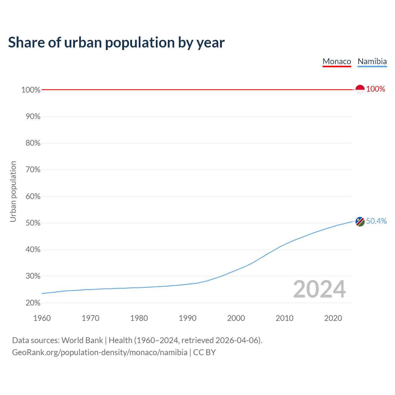 From 2004 to 2024, the share of urban population changed from 100% to 100% in Monaco and from 35.5% to 50.4% in Namibia.