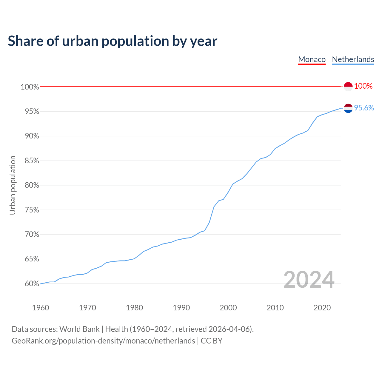 From 2004 to 2024, the share of urban population changed from 100% to 100% in Monaco and from 82.3% to 95.6% in the Netherlands.