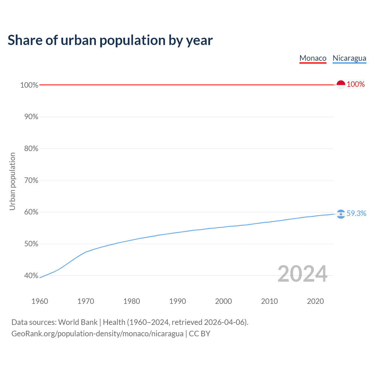 From 2004 to 2024, the share of urban population changed from 100% to 100% in Monaco and from 55.8% to 59.3% in Nicaragua.