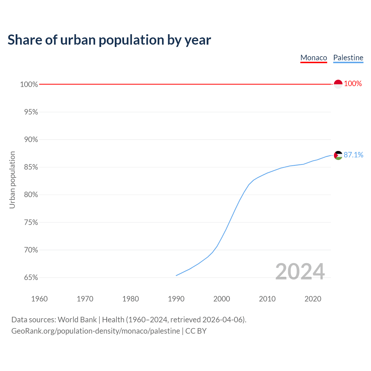 From 2004 to 2024, the share of urban population changed from 100% to 100% in Monaco and from 79% to 87.1% in Palestine.