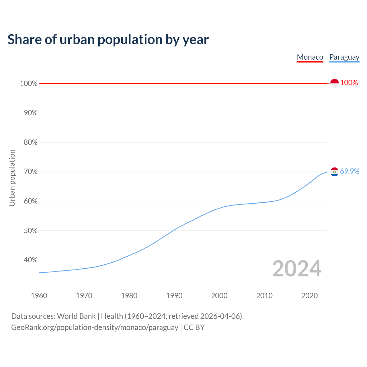 From 2004 to 2024, the share of urban population changed from 100% to 100% in Monaco and from 58.7% to 69.9% in Paraguay.