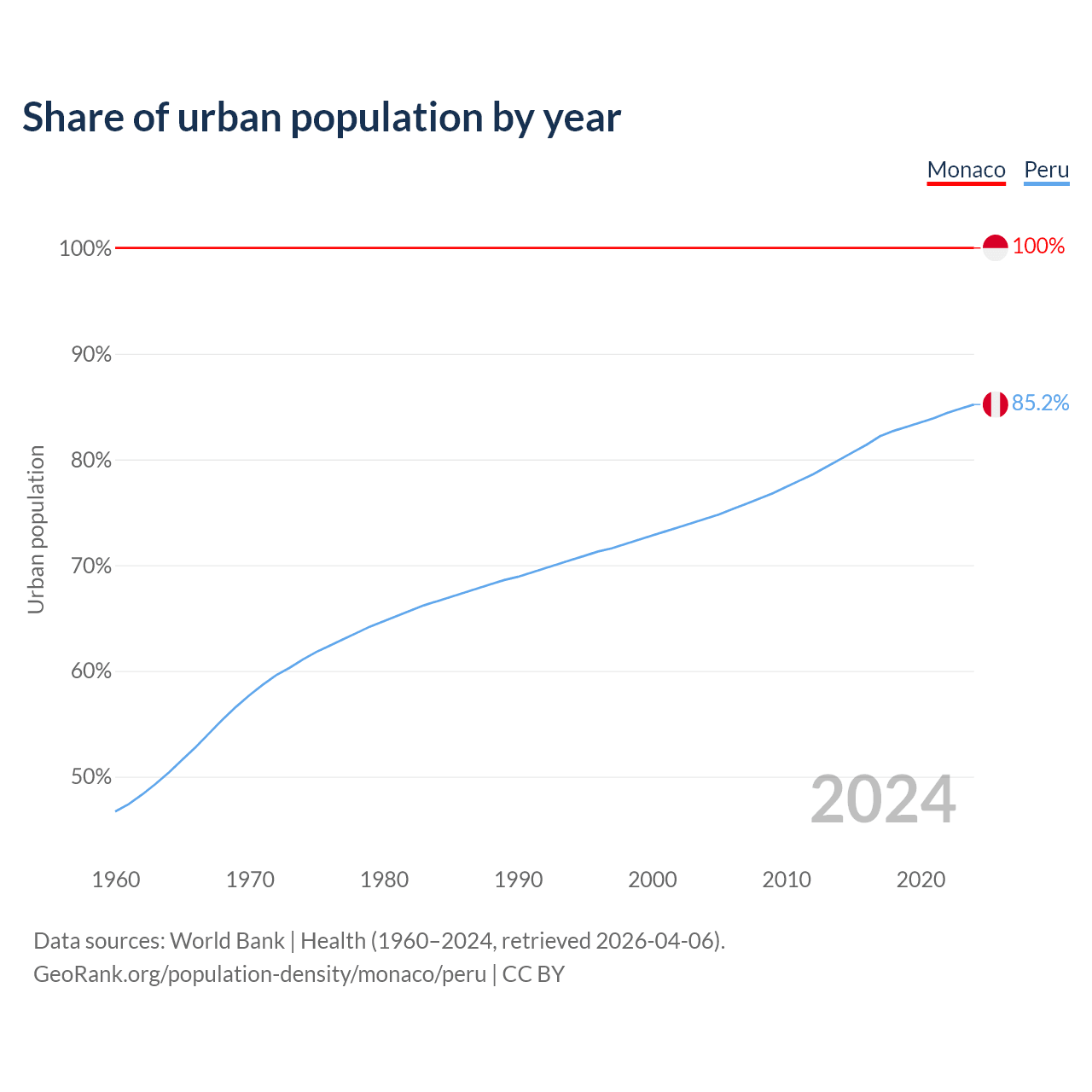 From 2004 to 2024, the share of urban population changed from 100% to 100% in Monaco and from 74.4% to 85.2% in Peru.