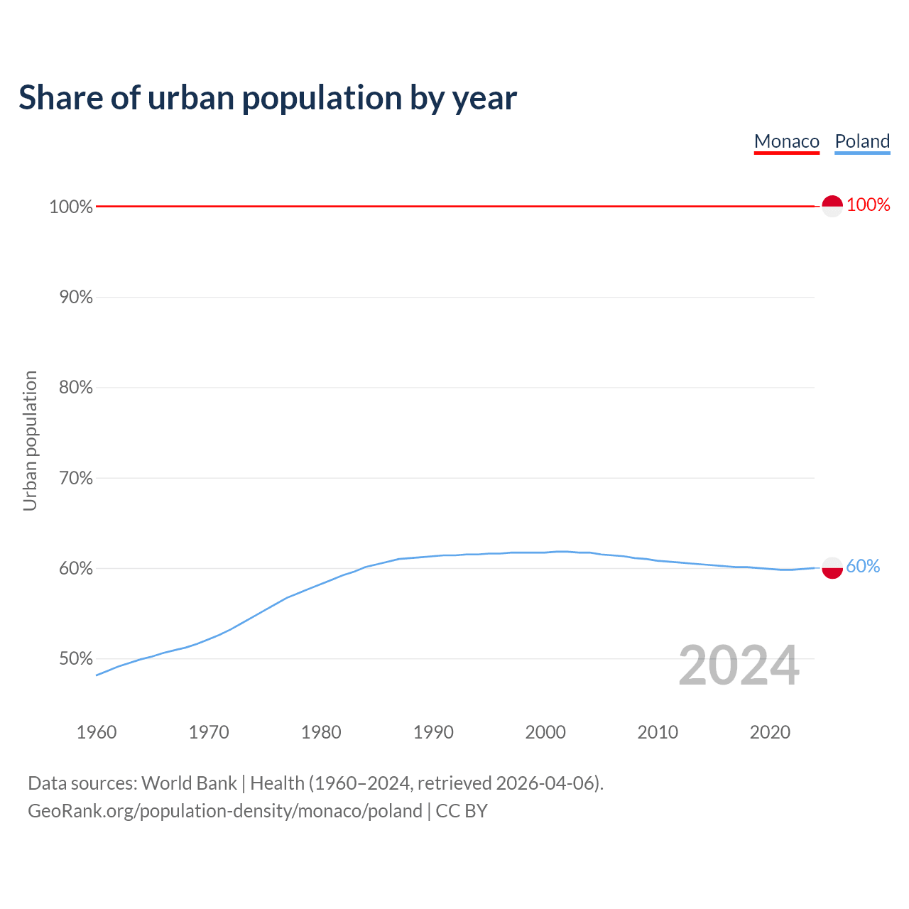 From 2004 to 2024, the share of urban population changed from 100% to 100% in Monaco and from 61.7% to 60% in Poland.