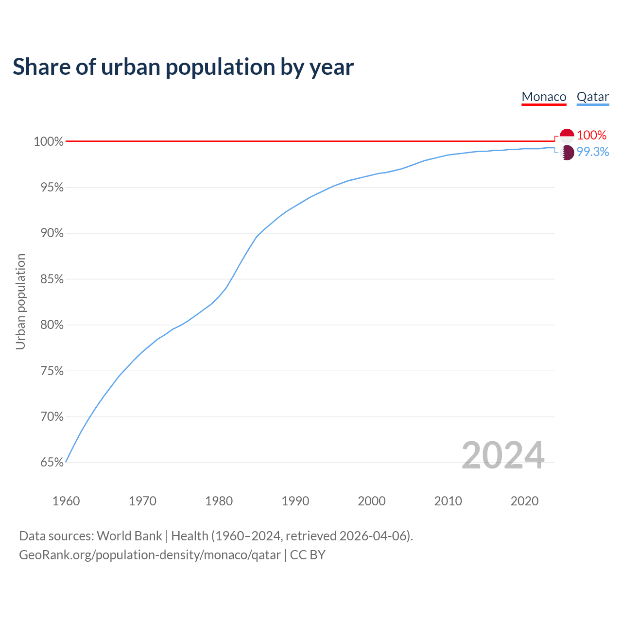 From 2004 to 2024, the share of urban population changed from 100% to 100% in Monaco and from 97% to 99.3% in Qatar.