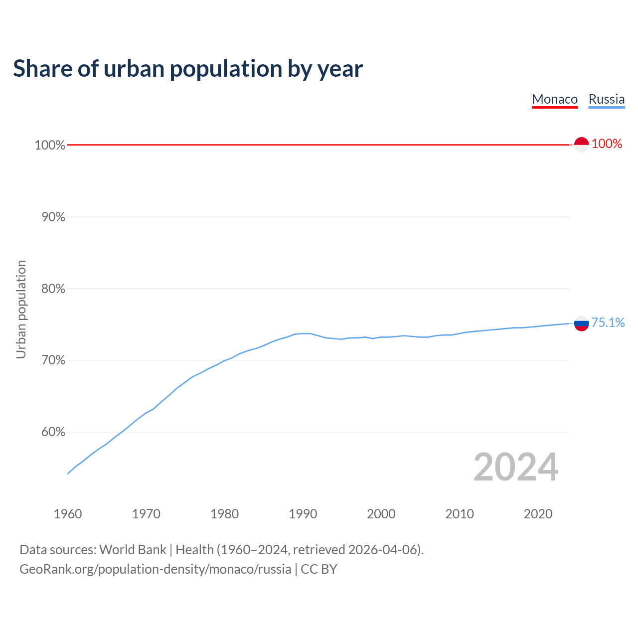 From 2004 to 2024, the share of urban population changed from 100% to 100% in Monaco and from 73.3% to 75.1% in Russia.