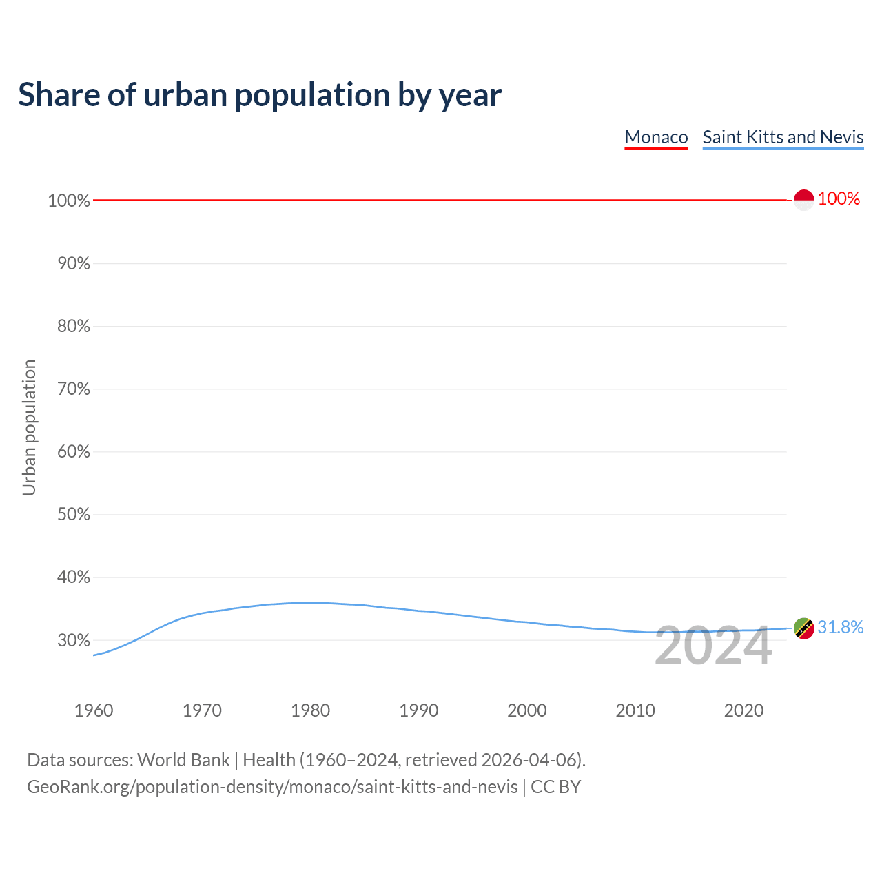From 2004 to 2024, the share of urban population changed from 100% to 100% in Monaco and from 32.1% to 31.8% in Saint Kitts and Nevis.
