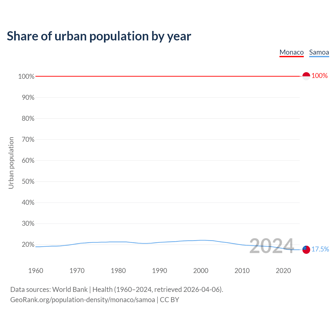 From 2004 to 2024, the share of urban population changed from 100% to 100% in Monaco and from 21.5% to 17.5% in Samoa.