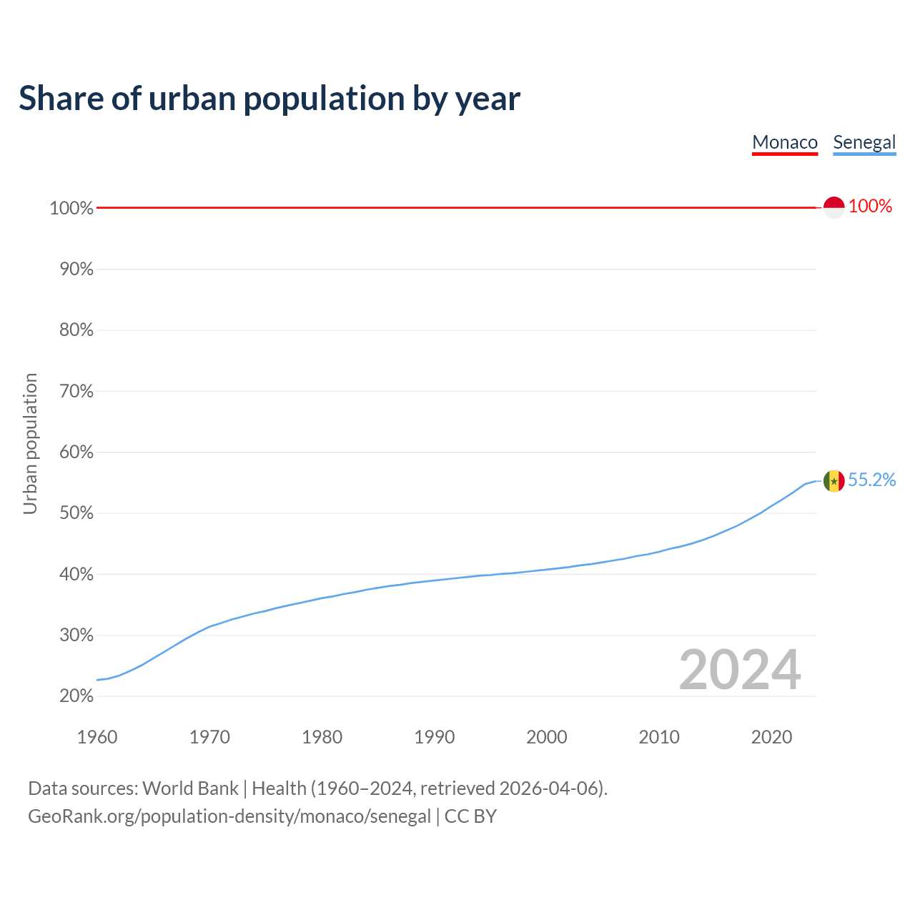 From 2004 to 2024, the share of urban population changed from 100% to 100% in Monaco and from 41.6% to 55.2% in Senegal.