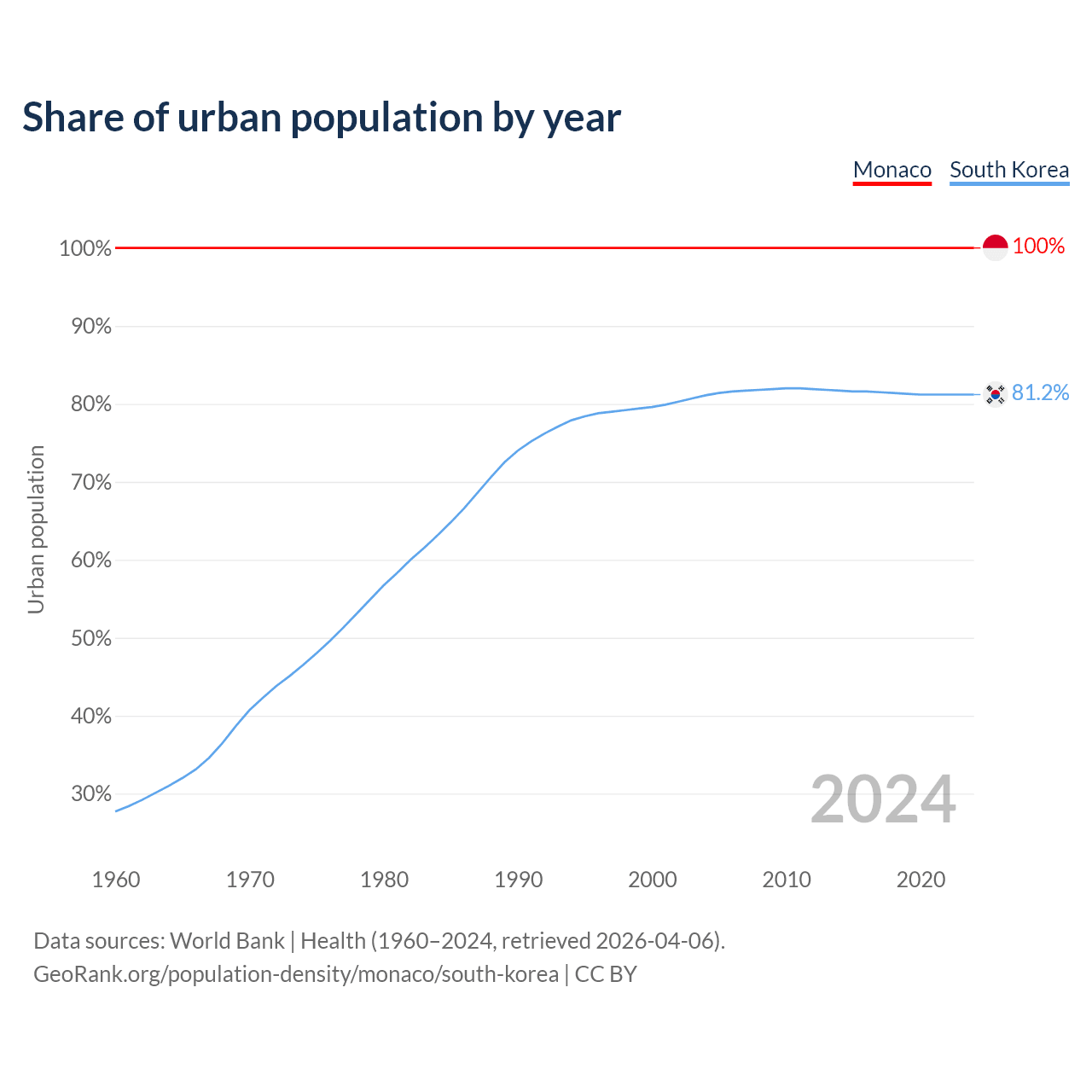From 2004 to 2024, the share of urban population changed from 100% to 100% in Monaco and from 81.1% to 81.2% in South Korea.