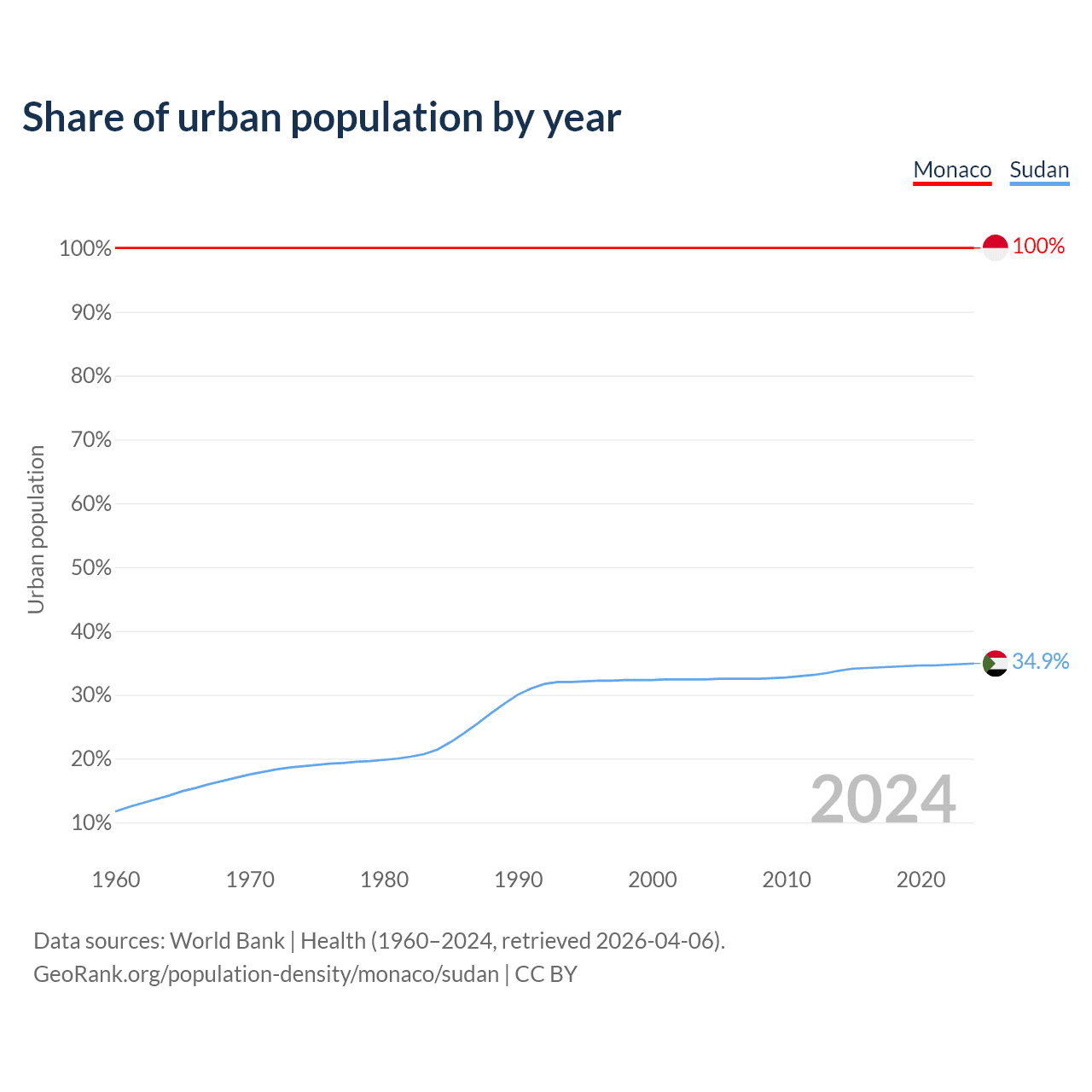 From 2004 to 2024, the share of urban population changed from 100% to 100% in Monaco and from 32.4% to 34.9% in Sudan.