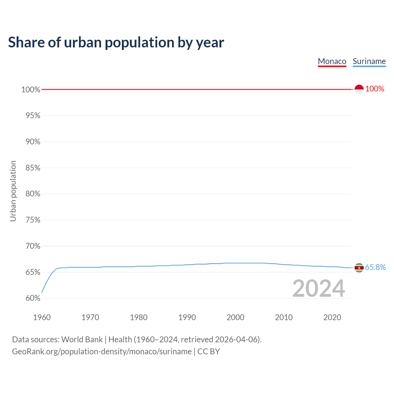 From 2004 to 2024, the share of urban population changed from 100% to 100% in Monaco and from 66.7% to 65.8% in Suriname.