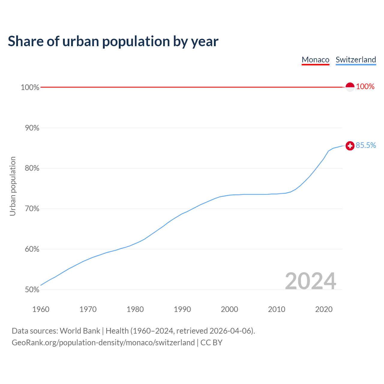 From 2004 to 2024, the share of urban population changed from 100% to 100% in Monaco and from 73.5% to 85.5% in Switzerland.