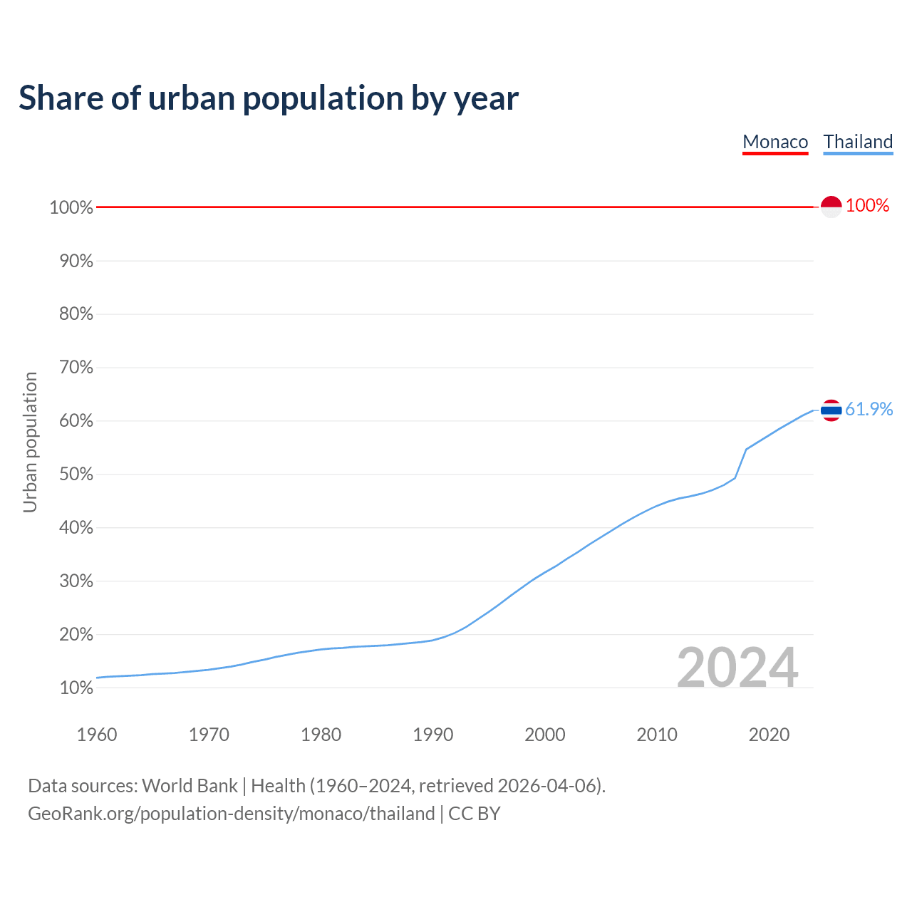 From 2004 to 2024, the share of urban population changed from 100% to 100% in Monaco and from 36.8% to 61.9% in Thailand.