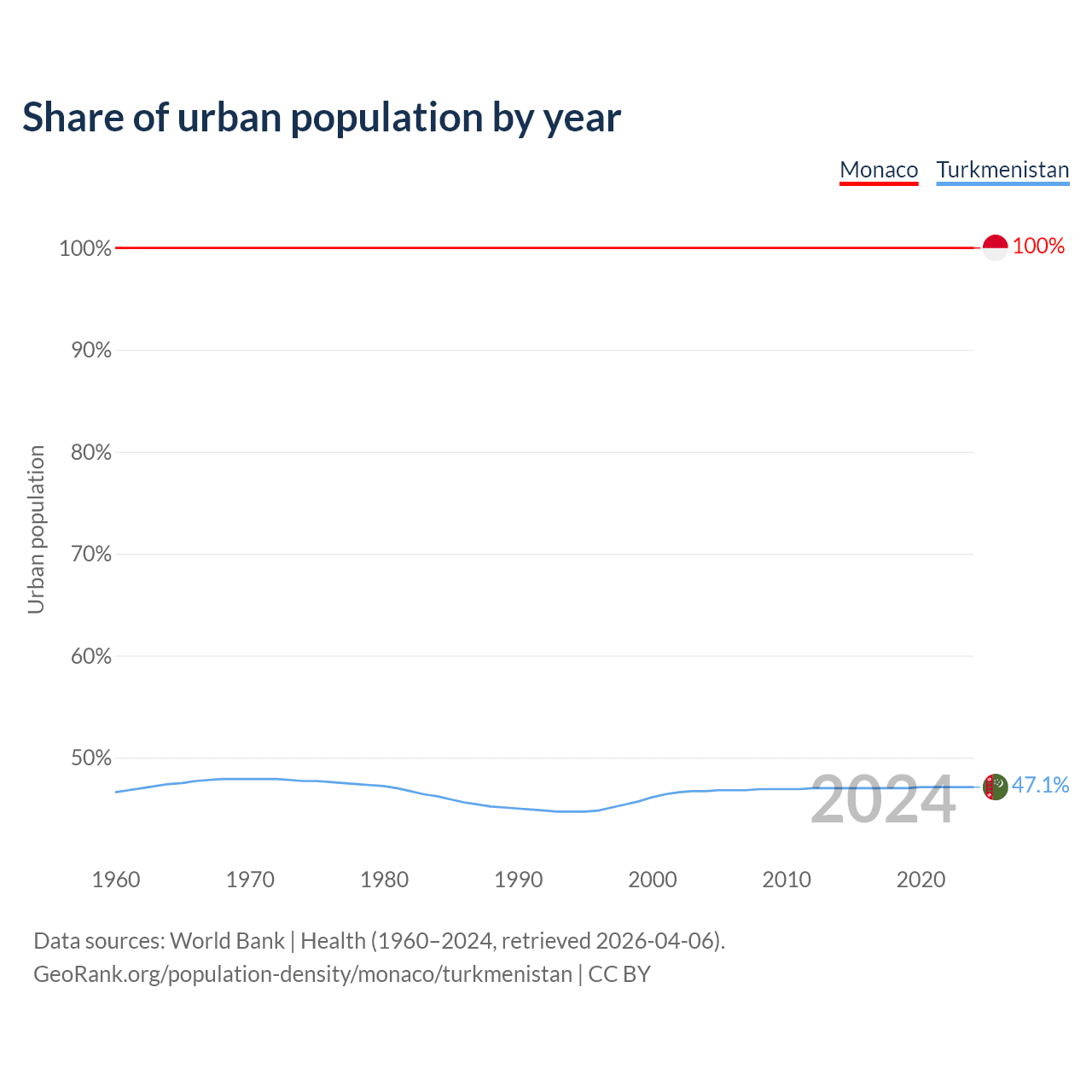 From 2004 to 2024, the share of urban population changed from 100% to 100% in Monaco and from 46.7% to 47.1% in Turkmenistan.