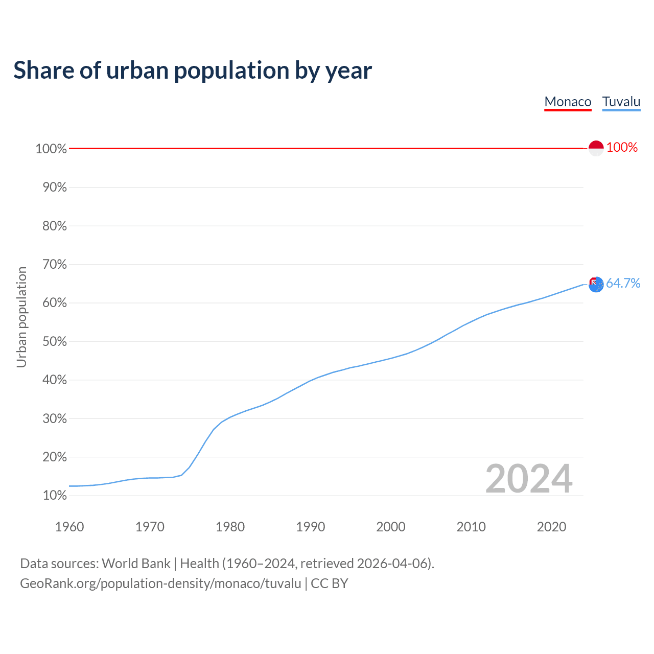 From 2004 to 2024, the share of urban population changed from 100% to 100% in Monaco and from 48.4% to 64.7% in Tuvalu.