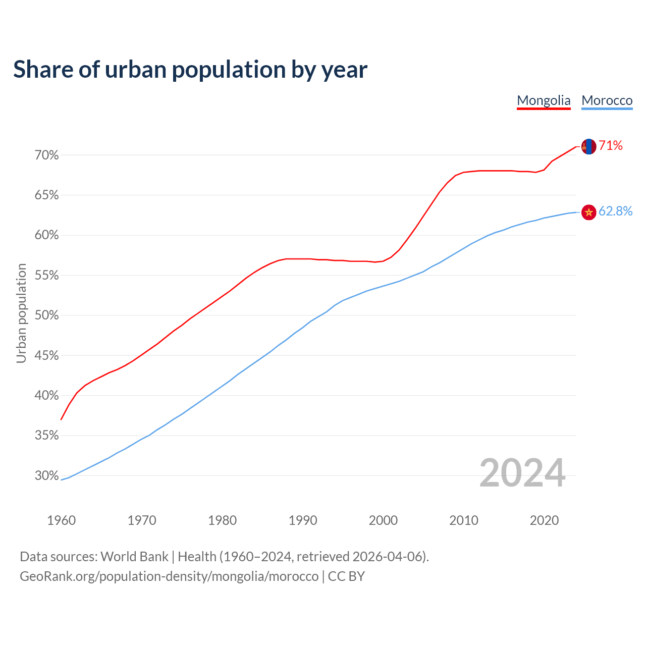 From 2004 to 2024, the share of urban population changed from 60.8% to 71% in Mongolia and from 55% to 62.8% in Morocco.