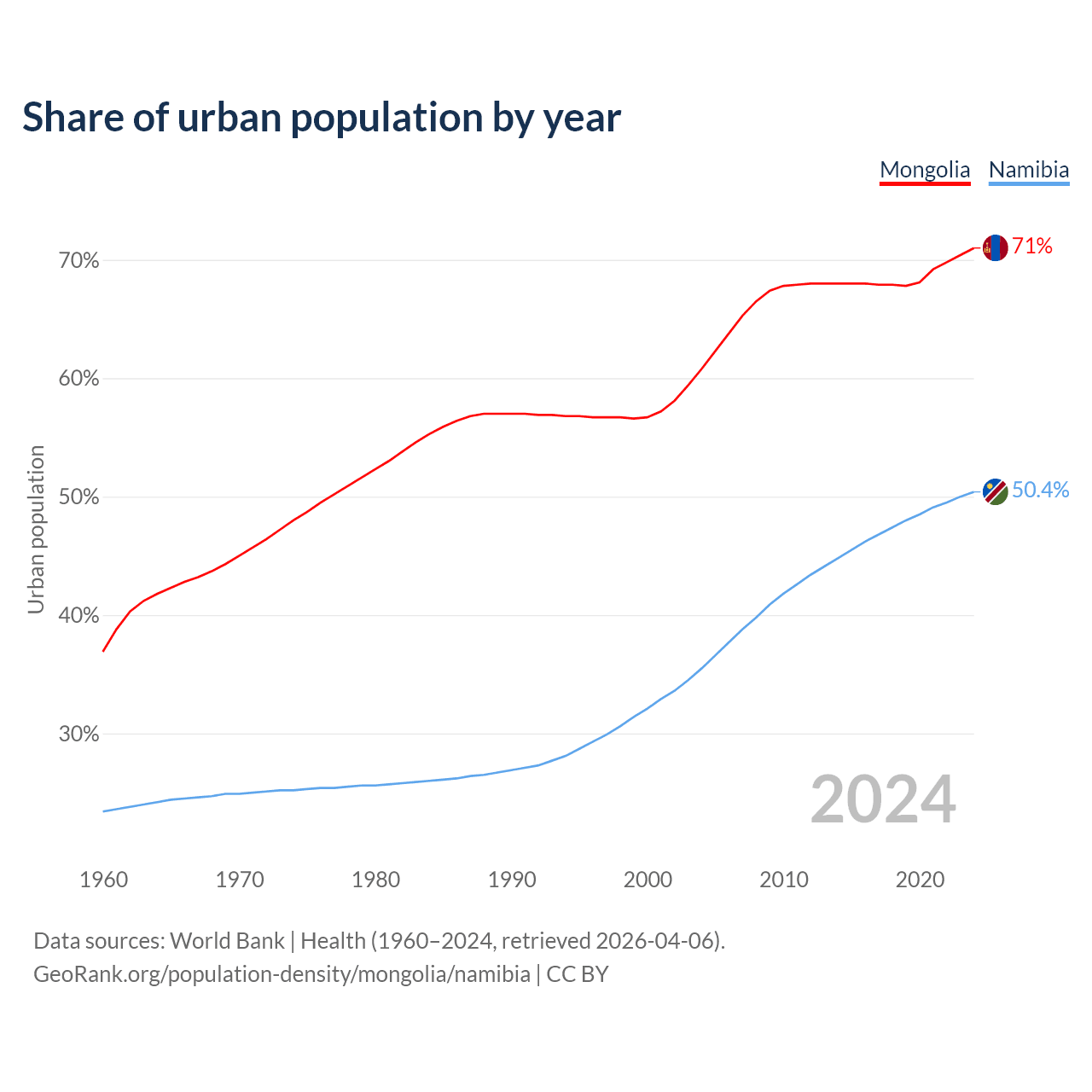 From 2004 to 2024, the share of urban population changed from 60.8% to 71% in Mongolia and from 35.5% to 50.4% in Namibia.