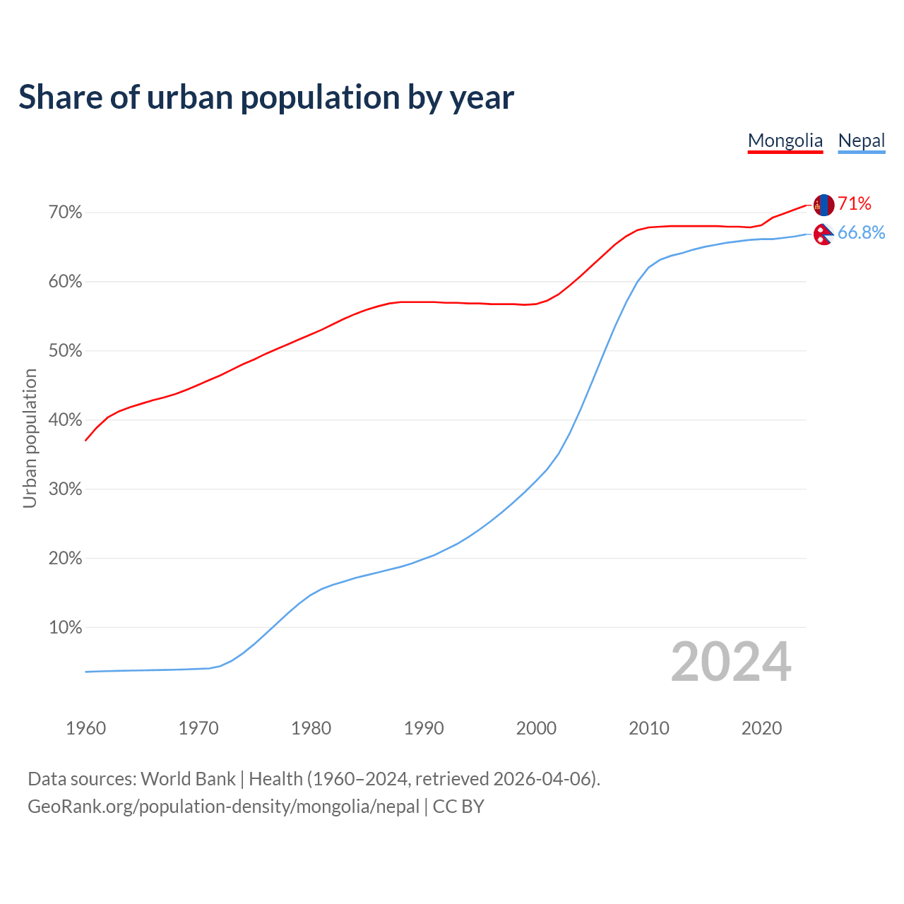 From 2004 to 2024, the share of urban population changed from 60.8% to 71% in Mongolia and from 41.6% to 66.8% in Nepal.