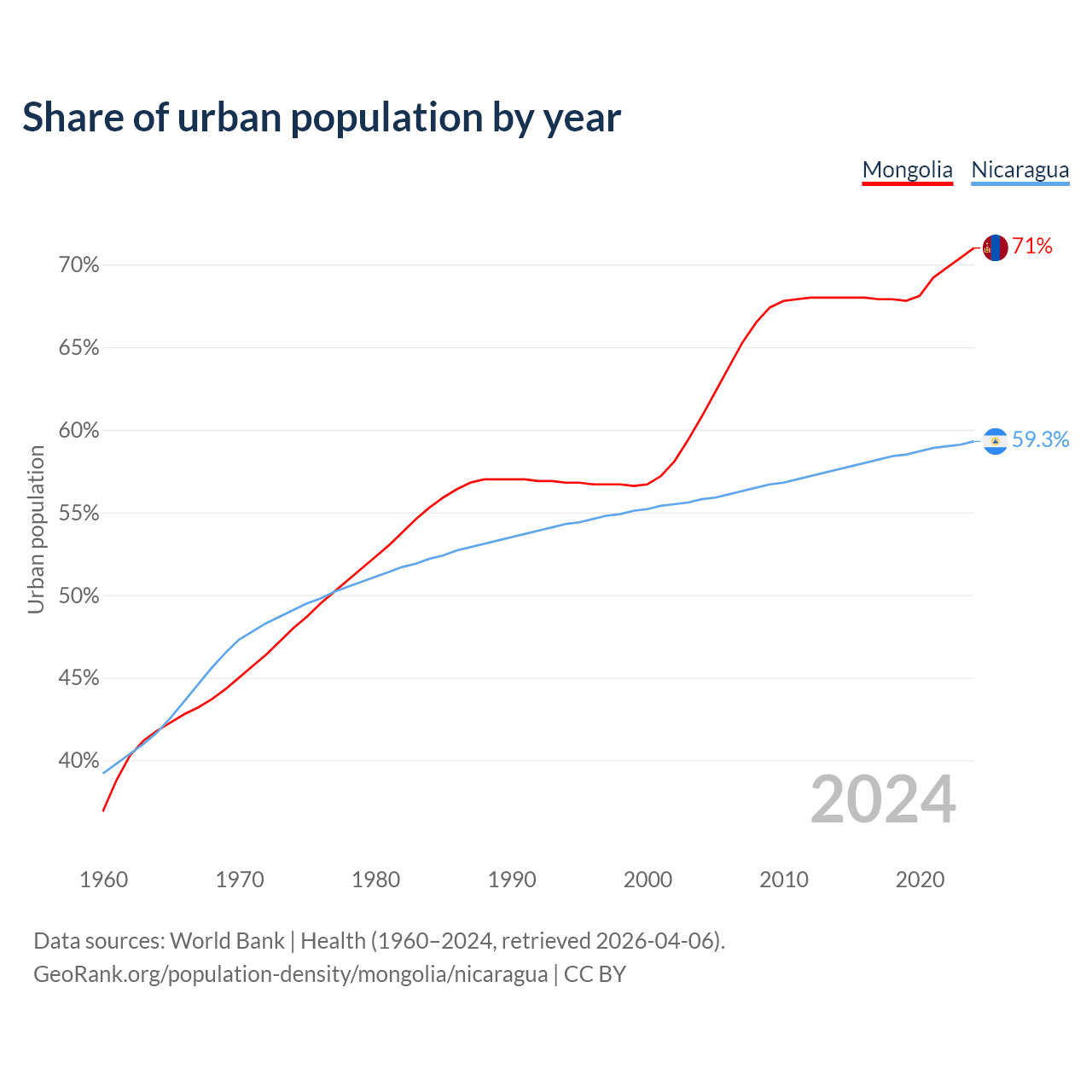 From 2004 to 2024, the share of urban population changed from 60.8% to 71% in Mongolia and from 55.8% to 59.3% in Nicaragua.