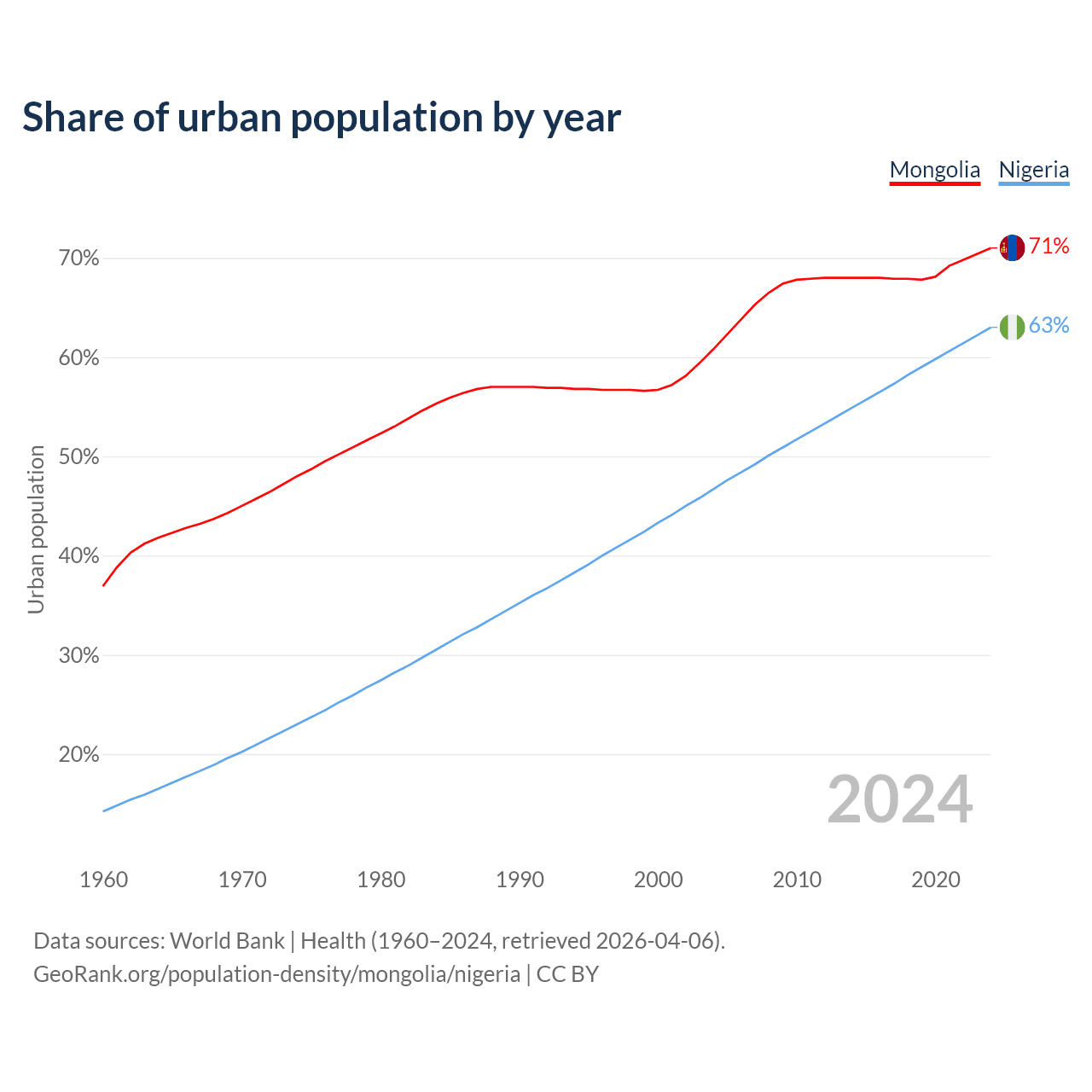 From 2004 to 2024, the share of urban population changed from 60.8% to 71% in Mongolia and from 46.7% to 63% in Nigeria.