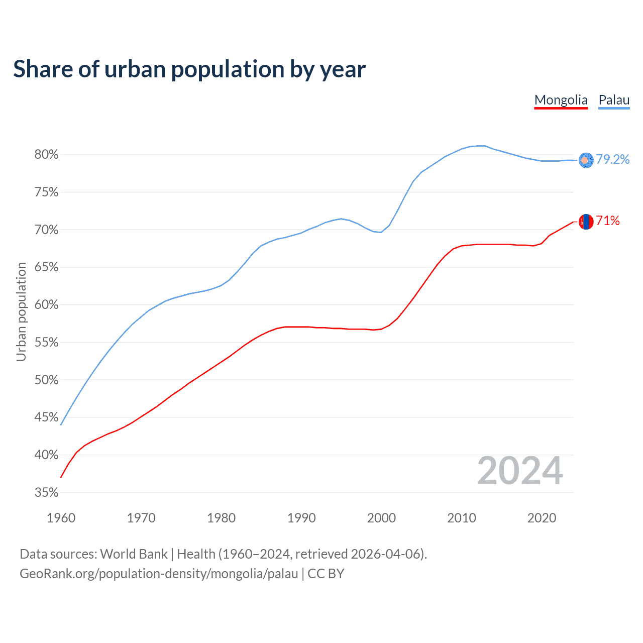 From 2004 to 2024, the share of urban population changed from 60.8% to 71% in Mongolia and from 76.4% to 79.2% in Palau.