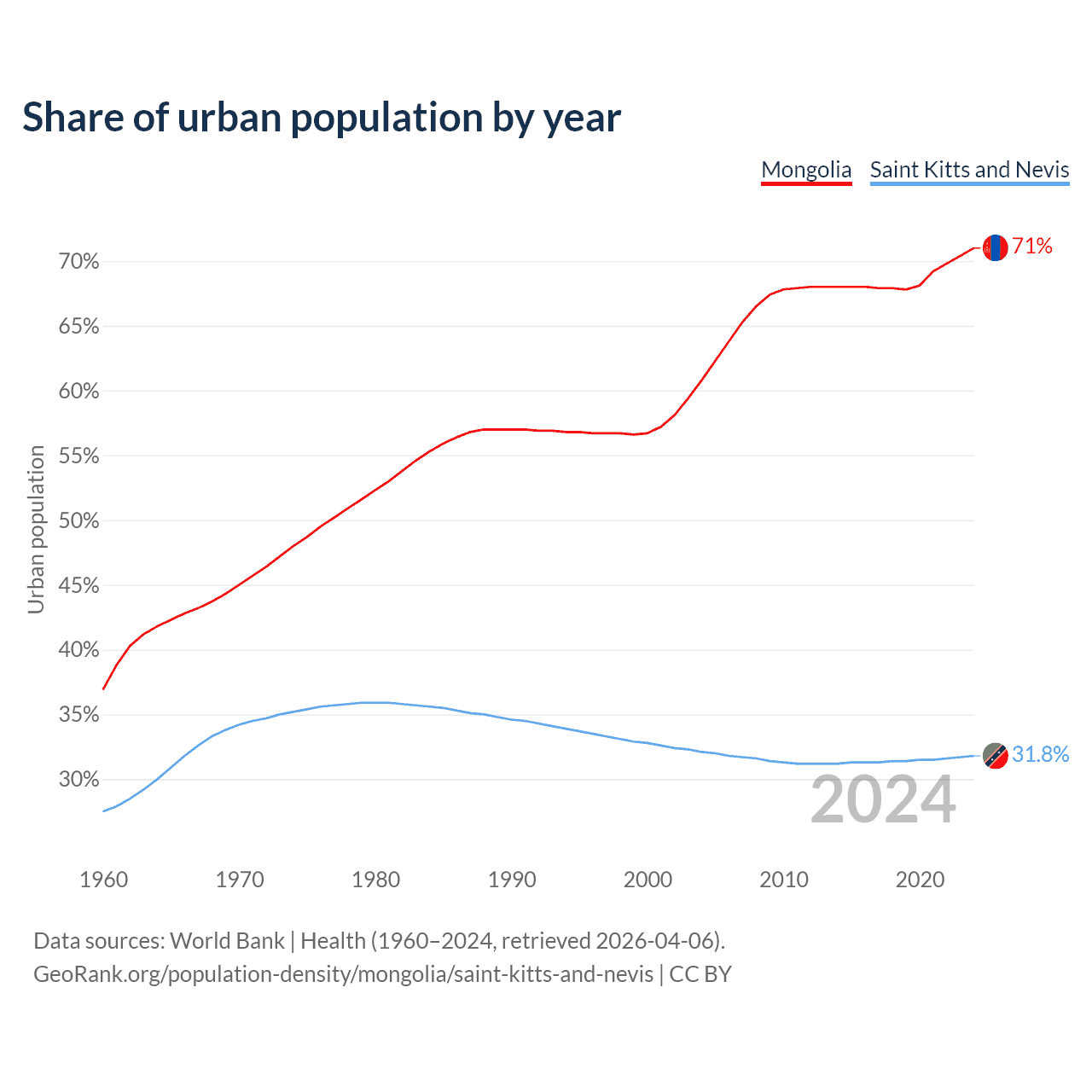 From 2004 to 2024, the share of urban population changed from 60.8% to 71% in Mongolia and from 32.1% to 31.8% in Saint Kitts and Nevis.