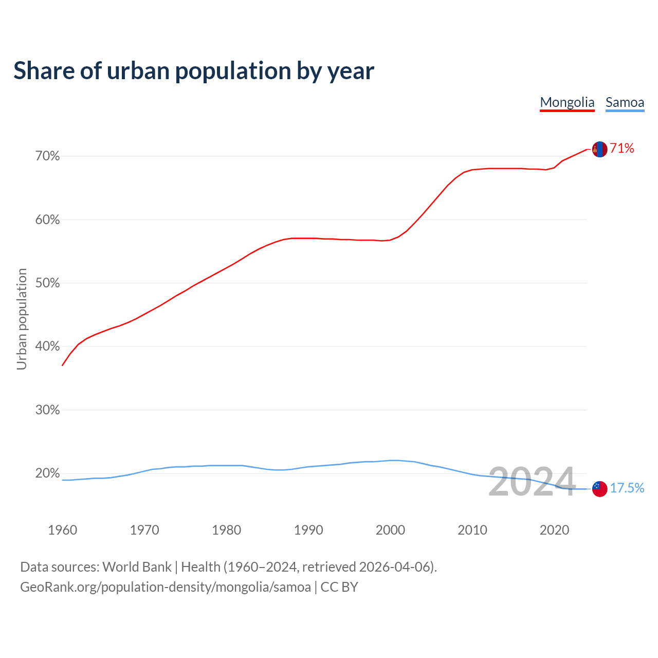 From 2004 to 2024, the share of urban population changed from 60.8% to 71% in Mongolia and from 21.5% to 17.5% in Samoa.