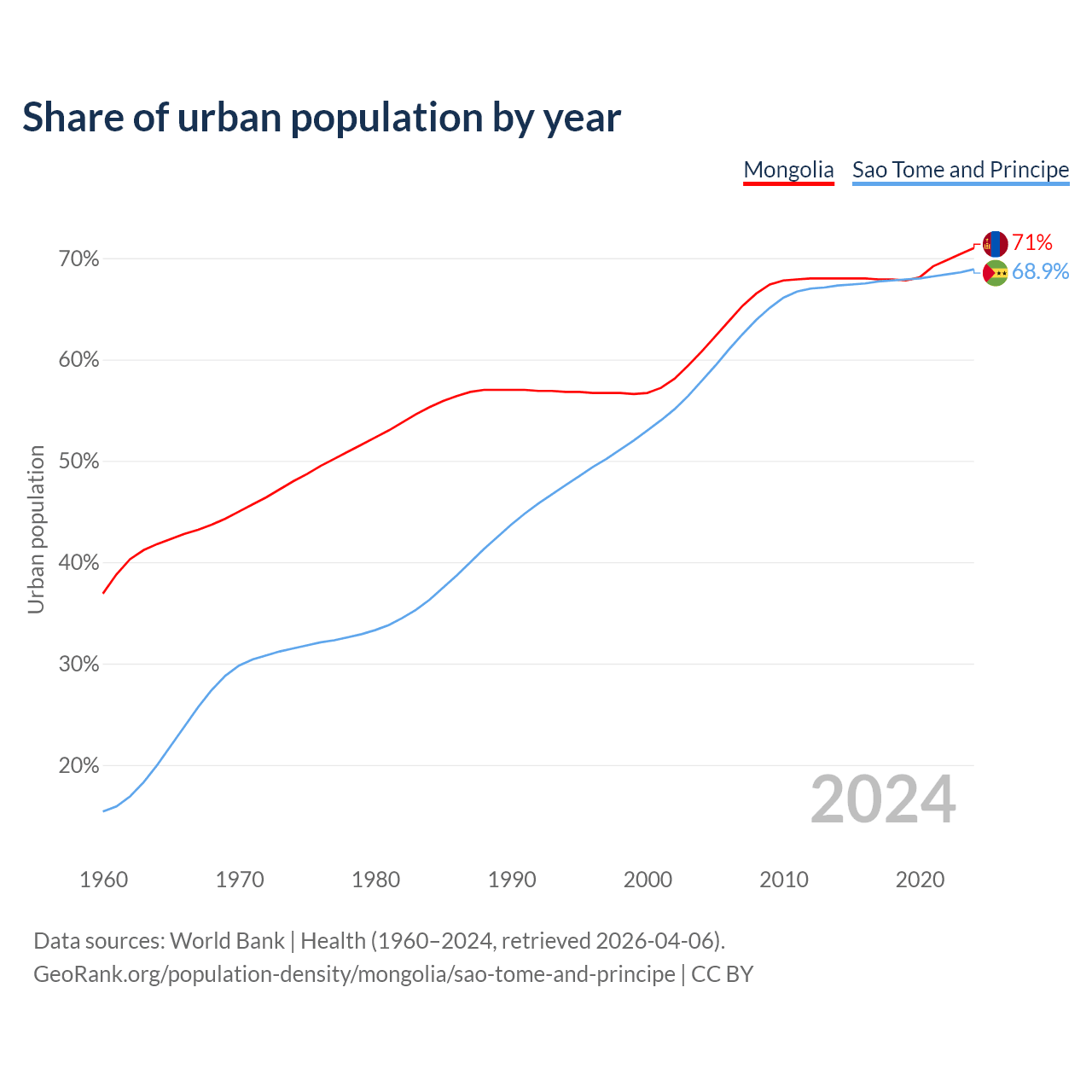 From 2004 to 2024, the share of urban population changed from 60.8% to 71% in Mongolia and from 57.9% to 68.9% in Sao Tome and Principe.