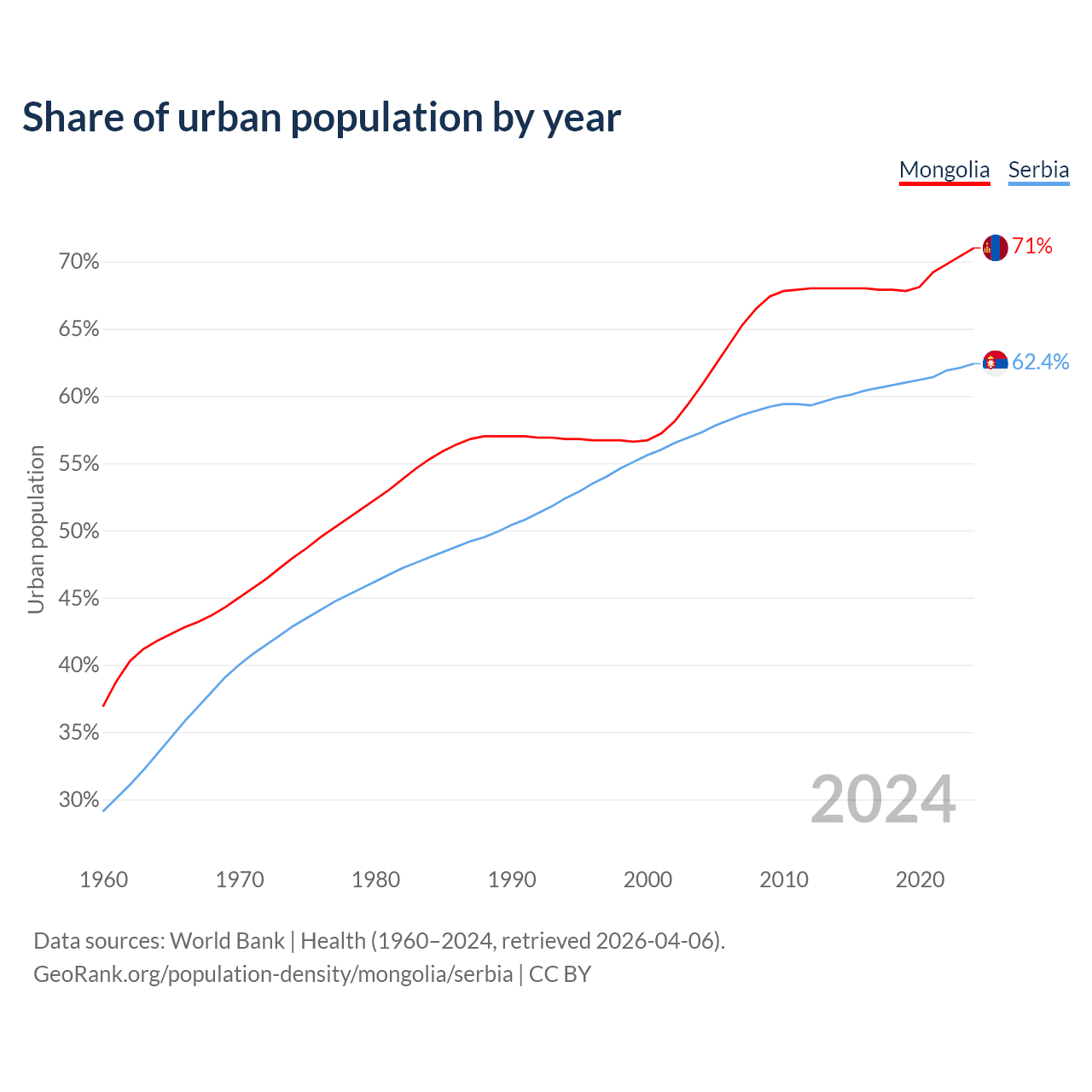 From 2004 to 2024, the share of urban population changed from 60.8% to 71% in Mongolia and from 57.3% to 62.4% in Serbia.