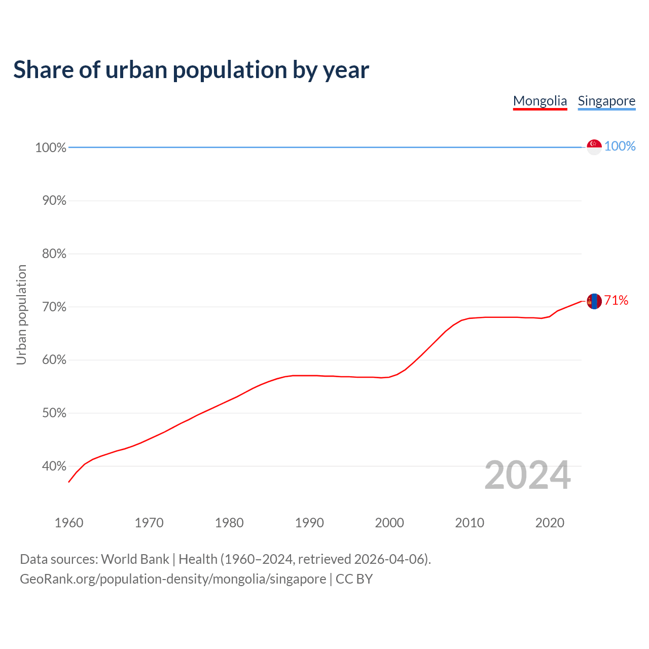 From 2004 to 2024, the share of urban population changed from 60.8% to 71% in Mongolia and from 100% to 100% in Singapore.