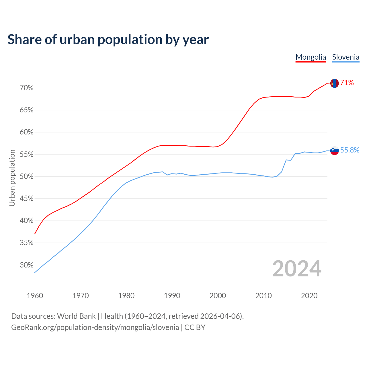From 2004 to 2024, the share of urban population changed from 60.8% to 71% in Mongolia and from 50.7% to 55.8% in Slovenia.