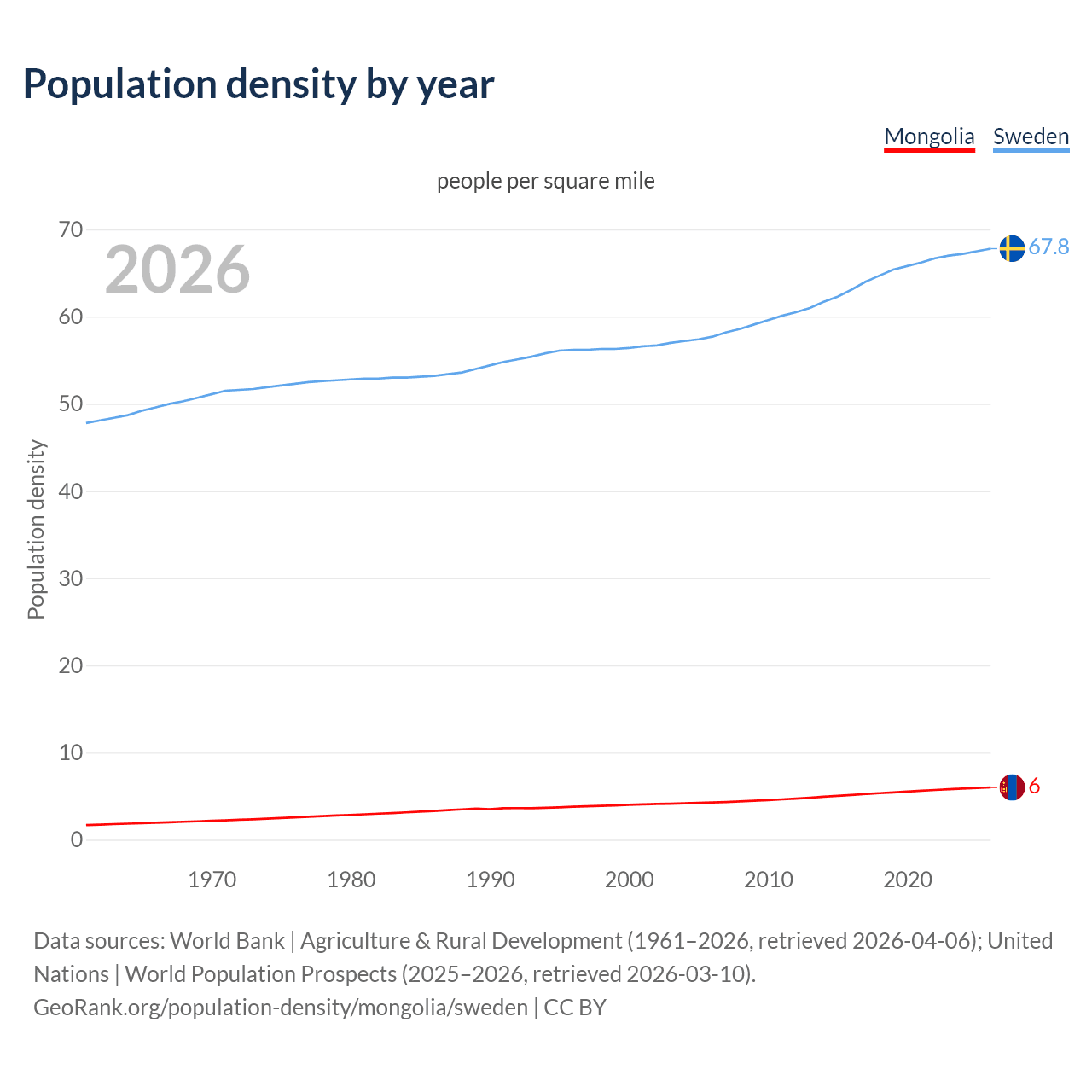 From 2006 to 2026, population density in Mongolia increased by 40.5%, compared to a 17.5% growth in Sweden.