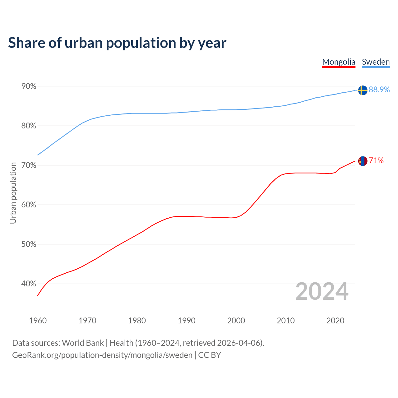 From 2004 to 2024, the share of urban population changed from 60.8% to 71% in Mongolia and from 84.3% to 88.9% in Sweden.