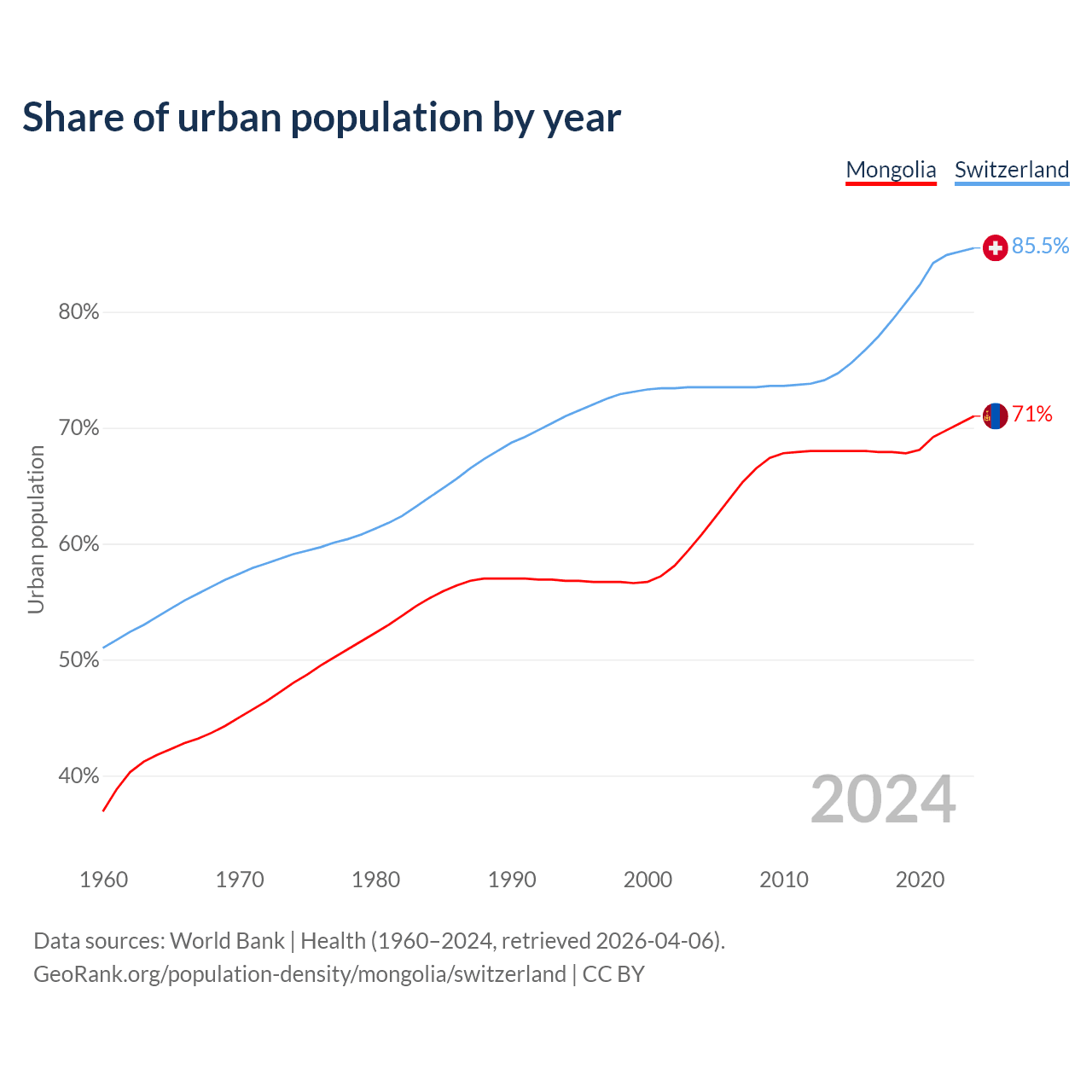 From 2004 to 2024, the share of urban population changed from 60.8% to 71% in Mongolia and from 73.5% to 85.5% in Switzerland.