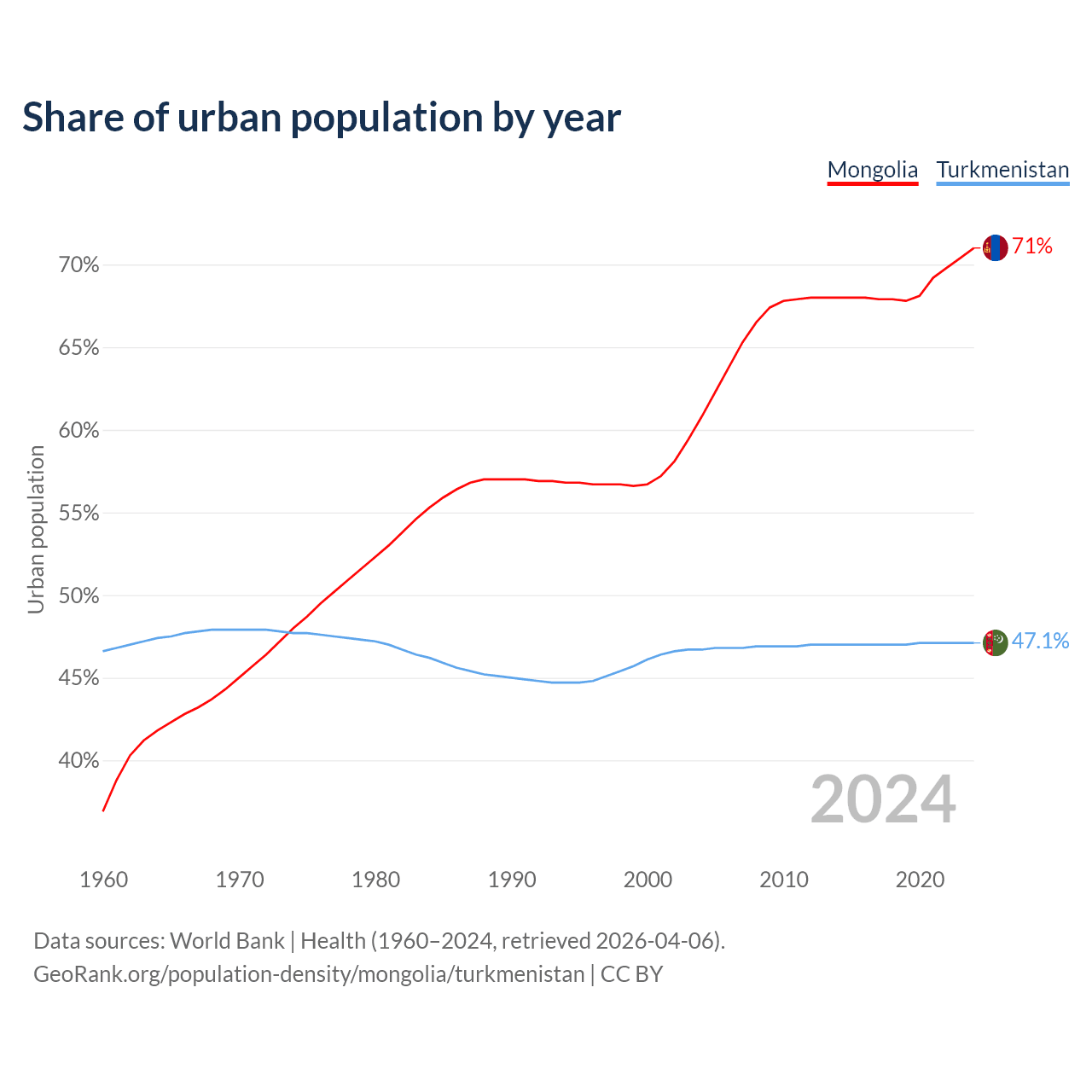 From 2004 to 2024, the share of urban population changed from 60.8% to 71% in Mongolia and from 46.7% to 47.1% in Turkmenistan.