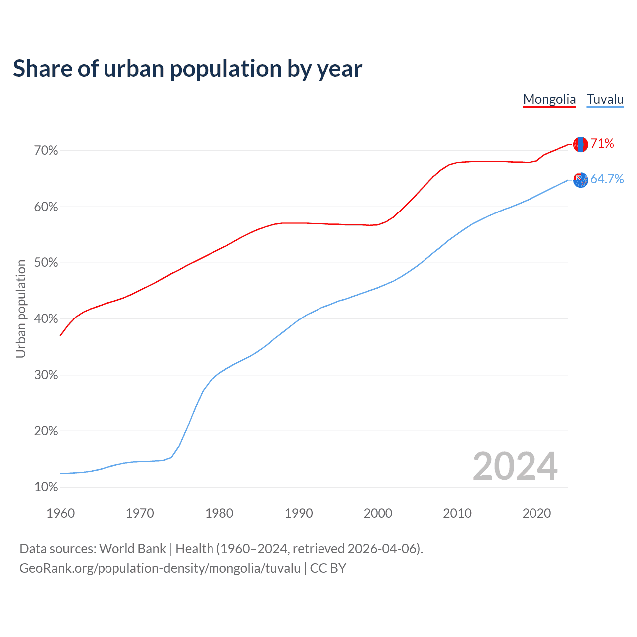 From 2004 to 2024, the share of urban population changed from 60.8% to 71% in Mongolia and from 48.4% to 64.7% in Tuvalu.