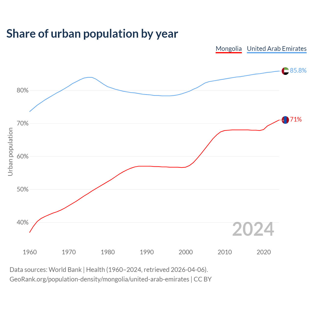 From 2004 to 2024, the share of urban population changed from 60.8% to 71% in Mongolia and from 81.5% to 85.8% in the United Arab Emirates.