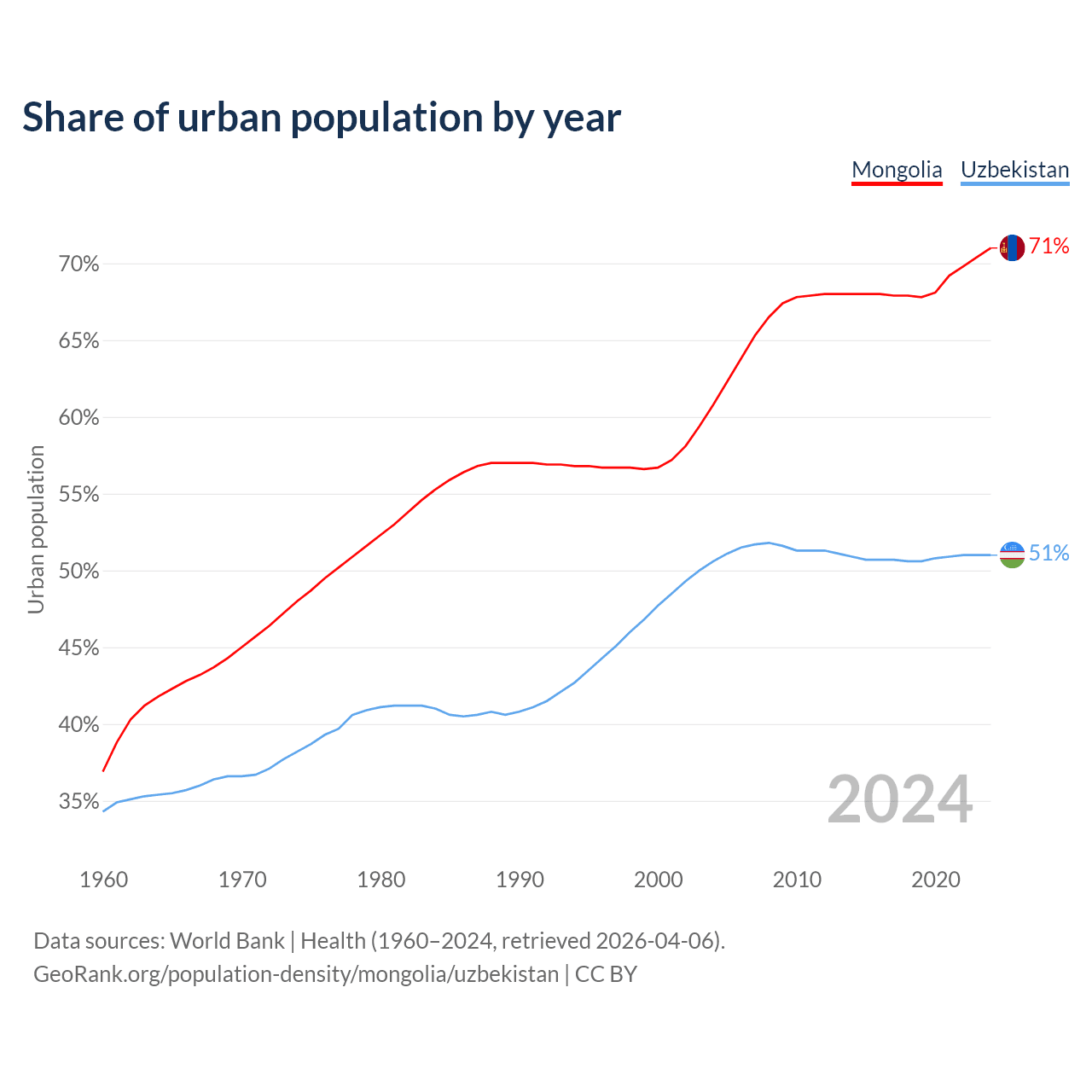 From 2004 to 2024, the share of urban population changed from 60.8% to 71% in Mongolia and from 50.6% to 51% in Uzbekistan.