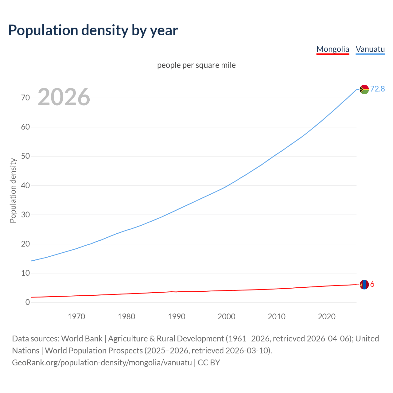 Mongolia has a population density of 6 people per square mile compared to 72.8 people in Vanuatu. Mongolia has 4,776,459 sq ft of land per person vs 400,309 sq ft in Vanuatu. Mongolia and Vanuatu rank 197th and 160th by population density, respectively.