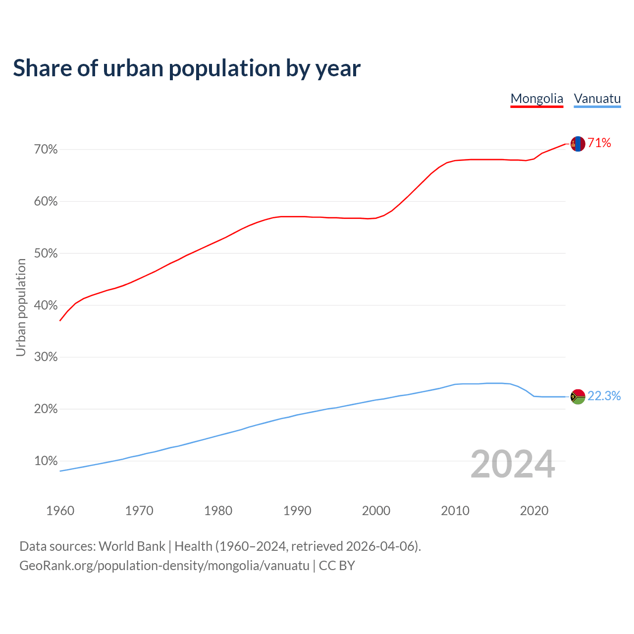 From 2004 to 2024, the share of urban population changed from 60.8% to 71% in Mongolia and from 22.7% to 22.3% in Vanuatu.