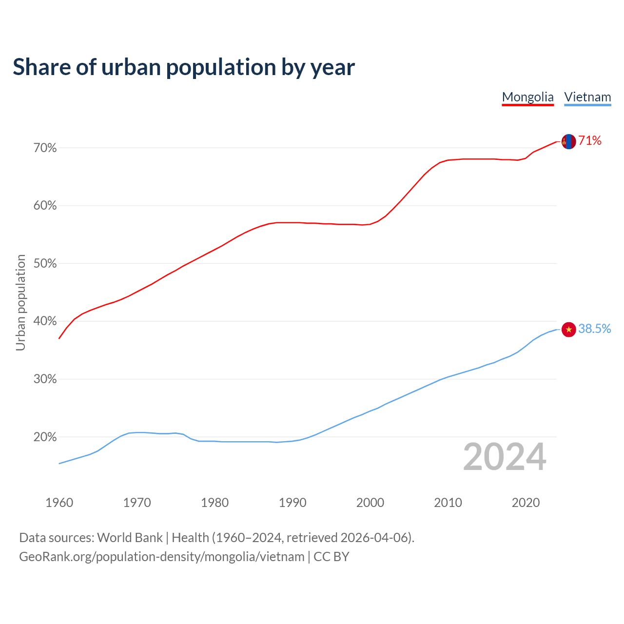 From 2004 to 2024, the share of urban population changed from 60.8% to 71% in Mongolia and from 26.8% to 38.5% in Vietnam.