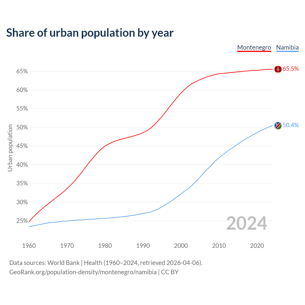 From 2004 to 2024, the share of urban population changed from 62.2% to 65.5% in Montenegro and from 35.5% to 50.4% in Namibia.
